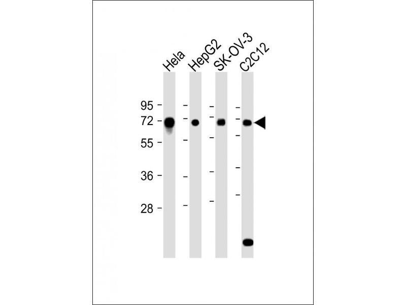 This Mouse Dyrk2 antibody is generated from rabbits immunized with a KLH conjugated synthetic peptide between 521-549 amino acids from the C-terminal region of mouse Dyrk2.