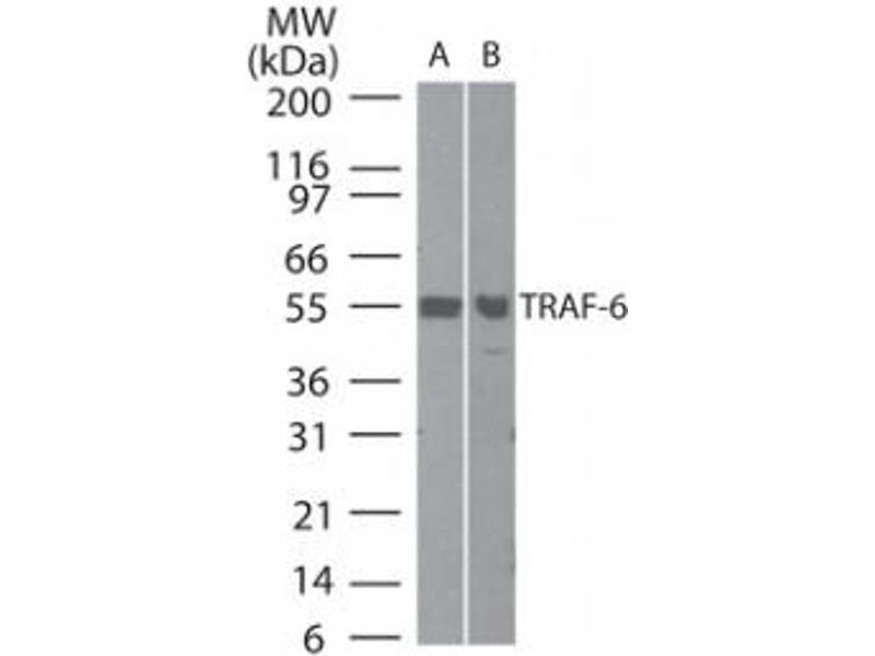 Background: Anti-TRAF6 Antibody detects human TRAF6. Tumor necrosis factor (TNF) induced signaling is mediated through association of TNF receptor (TNFR) with adaptor proteins, such as TNF receptor associated proteins (TRAFs). TRAFs form a family of cytoplasmic adapter proteins that mediate signal transduction from many members of the TNF-receptor superfamily (e.g. RANK, CD30, CD40, etc.) and the interleukin-1 receptor. The carboxy-terminal region of TRAFs is required for self-association and interaction with receptor cytoplasmic domains following ligand-induced oligomerization. Recent molecular cloning studies have lead to identification of six TRAFs (TRAF1-TRAF6). Recently it has been shown that TRANCE/OPGL activates the antiapoptotic serine/threonine kinase Akt/PKB through a signaling complex involving c-Src and TRAF6. Mice deficient in TNF receptor-associated factor 6 (TRAF6) are osteopetrotic with defects in bone remodeling and tooth eruption due to impaired osteoclast function. Like TRAF2 and TRAF3, TRAF6 is also essential for perinatal and postnatal survival. These findings establish unexpectedly diverse and critical roles for TRAF6 in perinatal and postnatal survival, bone metabolism, LPS, and cytokine signaling. RANK (TRANCE receptor) interacts with various TRAFs through distinct motifs and activates NF-kB via a novel TRAF6 interaction motif, which then activates NIK, thus leading to NF-kB activation. Over-expression of TRAF6 activates JNK, p38, or IKK in the absence of extracellular stimulation. Anti-TRAF6 Antibody is ideal for investigators involved in Toll Like Receptors and signaling, cyotkines, growth factors and AKT Singaling.