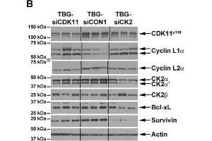 Background: Cyclin L (also referred to as CCNL) is encoded by two highly related genes Cyclin L1 and Cyclin L2 (CCNL1 and CCNL2, respectively). Cyclin L2 can be alternatively spliced to produce two isoforms (known as 1 and 2 or alpha and beta). The Cyclin L2 gene is located approximately 100-200 kb from the PITSLRE/CDK11 protein kinase locus in human (1p36) and in a syngenetic location on mouse chromosome 4q. Cyclin L2 is ubiquitous, expressed at much higher levels than Cyclin L1, and thus is likely the major partner for the CDK11p110 protein kinase.