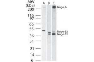 Anti-Nogo A/B Antibody has been tested by WB, ELISA, ICC/IF, IHC, IHC-P. Expect a band approximately 48-50kDa on specific lysates. Specific conditions for reactivity should be optimized by the end user.