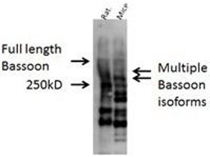 - Bassoon Antibody was produced from whole rabbit serum prepared by repeated immunizations with a N-terminal his-tagged fusion protein.