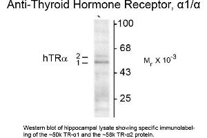 Background: Thyroid Hormone Receptor alpha 1/2 antibody detects TRα1 and TRα2. Thyroid hormones are essential for development of the central nervous system and deficits in these hormones during development affects such cognitive functions as learning and memory. Thyroid hormones exert their physiological role mainly through binding to specific nuclear receptors including the predominant isoforms of thyroid hormone receptors TRα1, TRα2, TRβ1 and TRβ2. TRα1, TRβ1 and TRβ2 bind T3 with high affinity and also bind to thyroid hormone response elements (TREs) on chromatin to regulate the transcriptional processes in several target tissues, including adult rat brain. Anti-TRα1/ TRα2 Antibody is ideal for investigators involved in Cell Signaling, Neuroscience, Signal Transduction research.