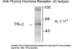 Anti-Thyroid Hormone Receptor alpha 2 antibody is tested for use in Western Blotting. Specific conditions for reactivity should be optimized by the end user. Expect a band or approximately 58 kDa in size corresponding to TR-α2 proteins in the appropriate cell lysate or extract.