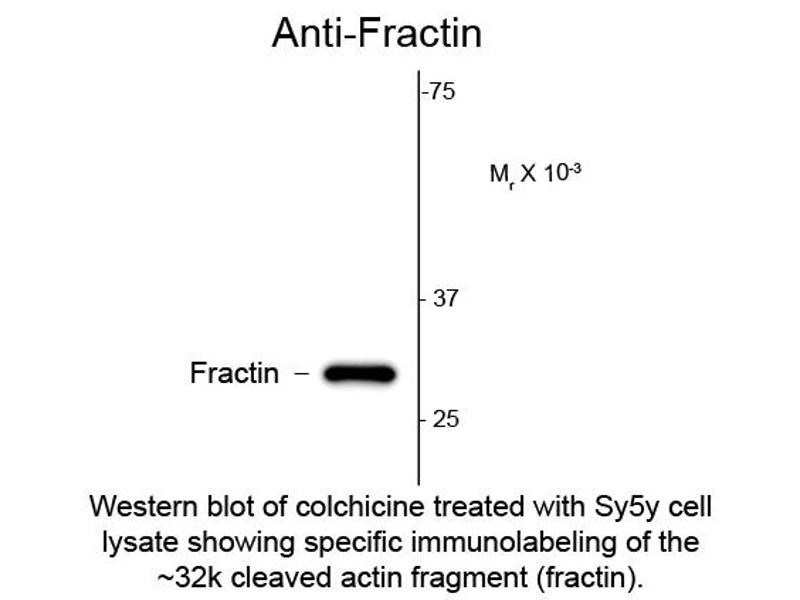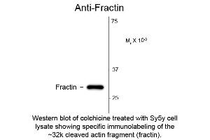 Background: Fractin Antibody detects human Fractin (fragment of actin) which is a caspase-specific cleavage product of actin and serves as a novel marker of apoptosis-related events. The antibody has been shown to detect the processes and cell bodies of degenerating neurons and plaque-associated microglia in Alzheimer's disease. It has recently been reported that Fractin may have a functional role in apoptotic signaling in oligodendrocytes. Anti-Fractin Antibody is ideal for investigators involved in Cell Apoptosis and, more generally in Neuroscience.