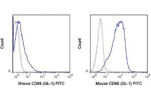 Background: Anti-CD86 reacts with mouse CD86, also known as B7-2, an 80 kDa cell surface protein which is a ligand for CD28, a co-stimulatory receptor for the T cell receptor (TCR). CD28 can also bind a second B7 ligand known as CD80 (B7-1). Both CD80 and CD86 are expressed on activated B cells and antigen-presenting cells. These ligands trigger CD28 signaling in concert with TCR activation to drive T cell proliferation, induce high-level expression of IL-2, impart resistance to apoptosis, and enhance T cell cytotoxicity. The interaction / co-stimulatory signaling between the B7 ligands and CD28 provides crucial communication between T cells and B cells or APCs to coordinate the adaptive immune response. The GL-1 antibody may be used as a marker for CD86 expression on B cells, macrophages, and dendritic cells.