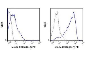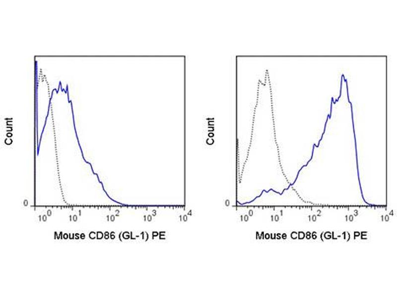 Background: Anti-CD86 reacts with mouse CD86, also known as B7-2, an 80 kDa cell surface protein which is a ligand for CD28, a co-stimulatory receptor for the T cell receptor (TCR). CD28 can also bind a second B7 ligand known as CD80 (B7-1). Both CD80 and CD86 are expressed on activated B cells and antigen-presenting cells. These ligands trigger CD28 signaling in concert with TCR activation to drive T cell proliferation, induce high-level expression of IL-2, impart resistance to apoptosis, and enhance T cell cytotoxicity. The interaction / co-stimulatory signaling between the B7 ligands and CD28 provides crucial communication between T cells and B cells or APCs to coordinate the adaptive immune response. The GL-1 antibody may be used as a marker for CD86 expression on B cells, macrophages, and dendritic cells.