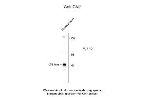Anti-CNP has been tested in western blot and IHC and is suitable for usage in ELISA. Specific conditions for reactivity should be optimized by the end user. Expect a 46kDa band by western blot corresponding to CNP protein in the appropriate cell lysate of tissue.