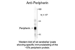 Anti-Peripherin Antibody is tested for use in Western Blotting and IF. Specific conditions for reactivity should be optimized by the end user. Expect a band of approximately 57 kDa in size corresponding to peripherin proteins in the appropriate cell lysate or extract.