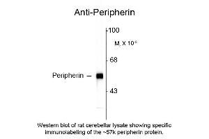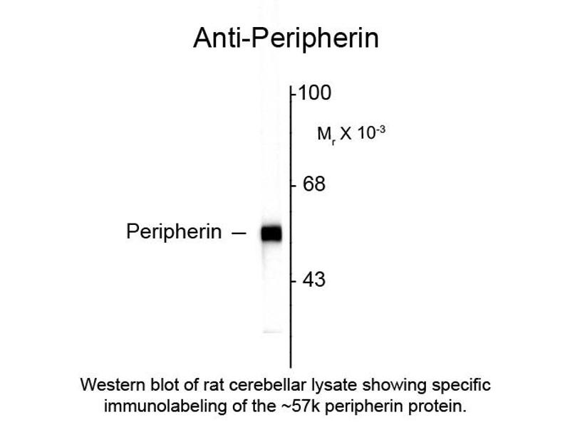 Anti-Peripherin Antibody is tested for use in Western Blotting, ICC, and IHC. Specific conditions for reactivity should be optimized by the end user. Expect a band of approximately 57 kDa in size corresponding to peripherin proteins in the appropriate cell lysate or extract. Anti-Peripherin antibody performs well on aldehyde fixed tissues.