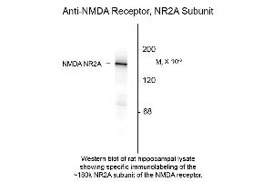 Anti-NMDA R2A Antibody has been tested by Western Blotting. Expect a band of approximately 180kDa in size corresponding to the NR2A subunit of the NMDA receptor in appropriate cell lysate or extract. A dilution of 1:1000 is recommended although specific conditions for reactivity should be optimized by the end user.
