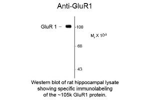 Anti-GluR1 (Mouse) antibody has been tested by Western Blotting. Specific conditions for reactivity should be optimized by the end user. Expect a band of approximately 100 kDa in size corresponding to GluR1 proteins in Western Blot in the appropriate cell lysate or extract. -