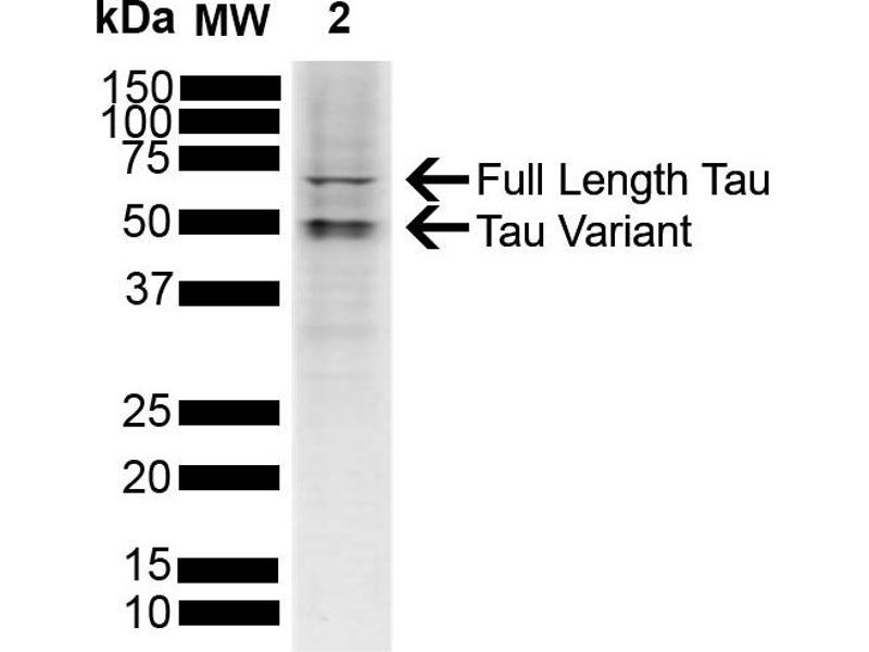 A 1:1000 dilution of ABIN6698754 was sufficient for detection of Tau in 10 μg of human SH-SY5Y cell lysate cell lysates by ECL immunoblot analysis using goat anti-rabbit IgG:HRP as the secondary antibody.