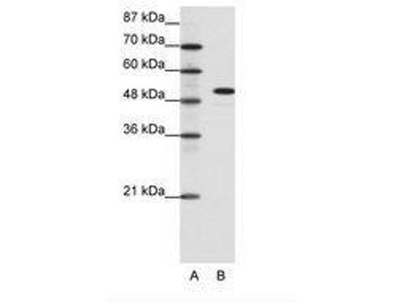 Synthetic peptide from C-Terminus of human SPIB (Q01892, NP_003112). Percent identity by BLAST analysis: Human, Gorilla, Monkey, Galago, Mouse, Rat, Elephant, Panda, Dog, Bovine, Rabbit, Horse, Guinea pig, Zebrafish (100%), Xenopus, Salmon (92%), Gibbon, Marmoset, Pig, Opossum, Turkey, Zebra finch, Chicken, Platypus, Lizard, Trout, Catfish (91%), Sablefish (85%).