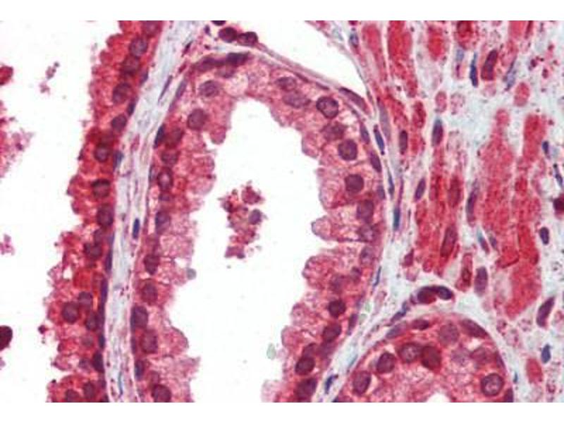 Usage: Immunohistochemistry: This antibody was validated for use in immunohistochemistry on a panel of 21 formalin-fixed, paraffin-embedded (FFPE) human tissues after heat induced antigen retrieval in pH 6.0 citrate buffer. After incubation with the primary antibody, slides were incubated with biotinylated secondary antibody, followed by alkaline phosphatase-streptavidin and chromogen. The stained slides were evaluated by a pathologist to confirm staining specificity. The optimal working concentration for this antibody was determined to be 5 μg/mL. -