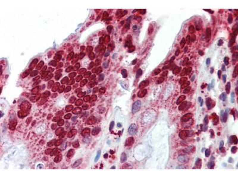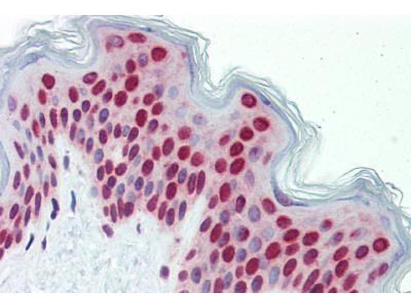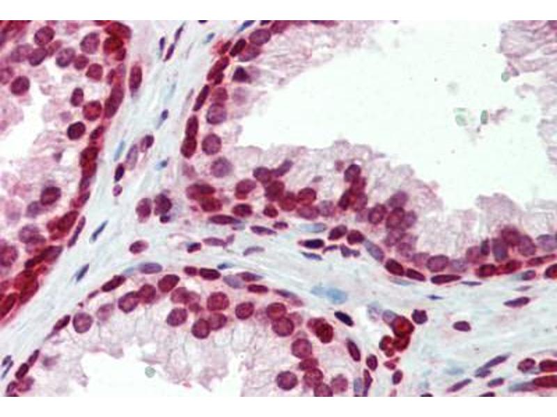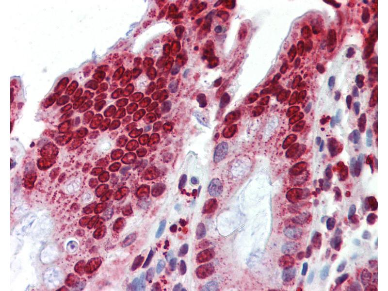 Usage: Immunohistochemistry: This antibody was validated for use in immunohistochemistry on a panel of 21 formalin-fixed, paraffin-embedded (FFPE) human tissues after heat induced antigen retrieval in pH 6.0 citrate buffer. After incubation with the primary antibody, slides were incubated with biotinylated secondary antibody, followed by alkaline phosphatase-streptavidin and chromogen. The stained slides were evaluated by a pathologist to confirm staining specificity. The optimal working concentration for this antibody was determined to be 5 μg/mL. -