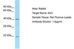 Synthetic peptide located between aa51-100 of rat Alx3 (Q6RW14, NP_001007013). Percent identity by BLAST analysis: Human, Chimpanzee, Gorilla, Rat, Elephant, Panda, Bat, Rabbit (100%), Orangutan, Gibbon, Monkey, Marmoset, Mouse, Horse, Guinea pig (92%), Galago, Hamster (85%).