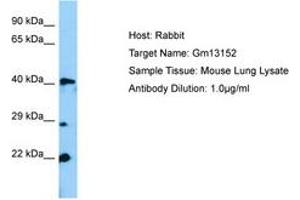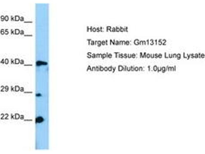 Synthetic peptide from N-Terminus of mouse Gm13152 (Q6PDN1, NP_001034298). Percent identity by BLAST analysis: Human, Chimpanzee, Gorilla, Orangutan, Gibbon, Monkey, Marmoset, Mouse (100%), Galago, Dog, Bovine, Horse, Pig (92%).