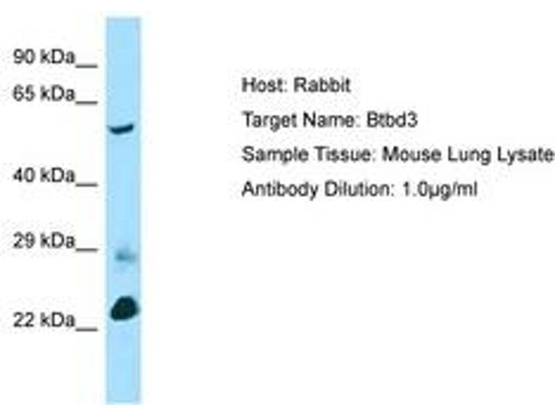 Synthetic peptide located between aa367-416 of mouse Btbd3 (Q3TSN9, NP_001020602). Percent identity by BLAST analysis: Human, Chimpanzee, Gorilla, Orangutan, Gibbon, Monkey, Galago, Marmoset, Mouse, Rat, Elephant, Panda, Dog, Bovine, Bat, Rabbit, Horse, Pig, Guinea pig, Lizard (100%), Opossum, Turkey, Zebra finch, Chicken, Platypus, Xenopus, Stickleback, Pufferfish (92%), Medaka, Zebrafish (85%).