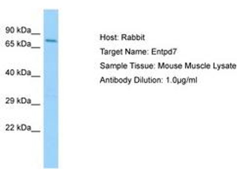 Synthetic peptide located between aa449-498 of mouse Entpd7 (Q3TCT4, NP_444333). Percent identity by BLAST analysis: Human, Chimpanzee, Gorilla, Orangutan, Gibbon, Monkey, Galago, Marmoset, Mouse, Rat, Elephant, Panda, Dog, Bovine, Horse, Pig, Guinea pig (100%), Bat, Rabbit, Opossum (92%).