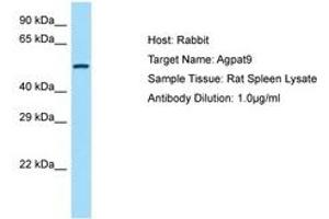 Synthetic peptide located between aa251-300 of rat Agpat9 (Q4V8J4, NP_001020841). Percent identity by BLAST analysis: Mouse, Rat (100%).