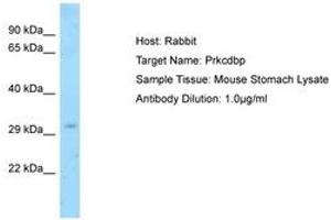 Synthetic peptide located between aa77-126 of mouse Prkcdbp (Q91VJ2, NP_082720). Percent identity by BLAST analysis: Human, Chimpanzee, Gorilla, Orangutan, Gibbon, Monkey, Mouse, Rat, Elephant, Panda, Dog, Bovine, Bat, Pig, Guinea pig (100%), Rabbit (92%), Galago, Opossum (85%).