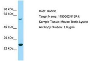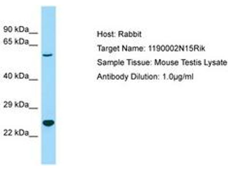 Synthetic peptide located between aa85-134 of mouse 1190002N15Rik (Q3USZ8, NP_001028317). Percent identity by BLAST analysis: Human, Chimpanzee, Gorilla, Orangutan, Gibbon, Monkey, Galago, Marmoset, Mouse, Rat, Elephant, Panda, Bovine, Bat, Opossum (100%), Rabbit (92%).