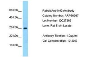 Synthetic peptide located between aa23-72 of rat Ntf3 (P18280, NP_112335). Percent identity by BLAST analysis: Human, Chimpanzee, Gorilla, Gibbon, Mouse, Rat, Elephant, Panda, Cat, Bovine, Bat, Rabbit, Horse, Guinea pig (100%), Dog, Pig, Chicken, Lizard (92%).