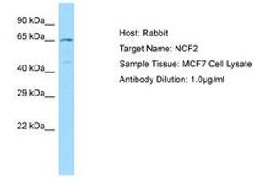 Synthetic peptide located between aa429-478 of human NCF2 (P19878, NP_000424). Percent identity by BLAST analysis: Human, Chimpanzee, Gorilla, Orangutan, Gibbon (100%), Monkey, Galago, Marmoset (92%), Elephant, Bat, Pig, Guinea pig (85%).
