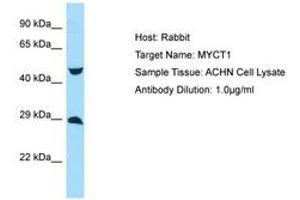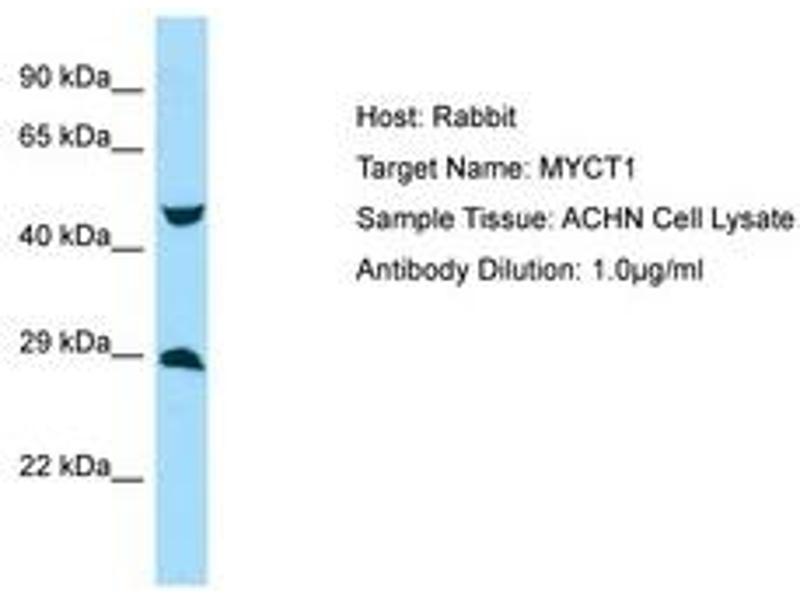 Synthetic peptide located between aa95-144 of human MYCT1 (Q8N699, NP_079383). Percent identity by BLAST analysis: Human, Chimpanzee, Gorilla, Gibbon, Monkey, Galago, Marmoset, Rat, Elephant, Panda, Dog, Bovine, Rabbit, Horse, Pig, Opossum, Guinea pig, Platypus (100%), Mouse, Bat (92%), Turkey, Zebra finch, Sparrow, Chicken (85%), Lizard, Xenopus (84%).