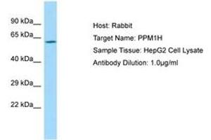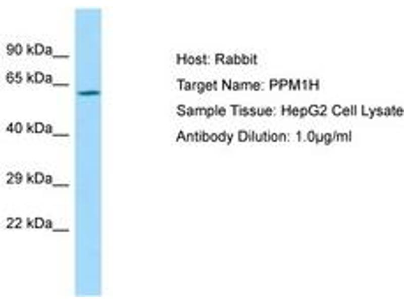 Synthetic peptide located between aa71-120 of human PPM1H (Q9ULR3, NP_065751). Percent identity by BLAST analysis: Human, Chimpanzee, Gorilla, Orangutan, Gibbon, Monkey, Galago, Marmoset, Mouse, Rat, Elephant, Panda, Dog, Bovine, Bat, Horse, Opossum, Guinea pig, Turkey, Zebra finch, Chicken, Lizard, Xenopus (100%), Rabbit, Platypus, Salmon, Stickleback, Pufferfish (85%).