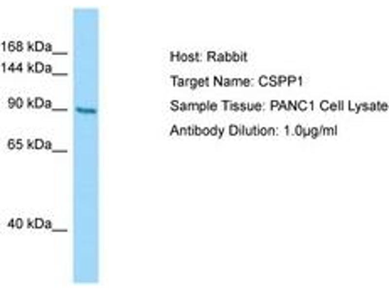 Synthetic peptide located between aa53-102 of human CSPP1 (NP_079066). Percent identity by BLAST analysis: Human, Chimpanzee, Gorilla, Gibbon, Monkey, Marmoset, Bovine, Bat, Rabbit, Horse, Turkey, Zebra finch (100%), Orangutan, Panda, Guinea pig (92%), Rat, Dog (85%).