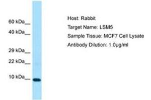 Synthetic peptide from C-Terminus of human LSM5 (Q9Y4Y9, NP_036454). Percent identity by BLAST analysis: Human, Chimpanzee, Gorilla, Orangutan, Gibbon, Monkey, Galago, Marmoset, Mouse, Rat, Elephant, Panda, Bovine, Bat, Rabbit, Horse, Pig, Opossum, Guinea pig, Turkey, Zebra finch, Chicken, Xenopus, Sea squirt, Drosophila (100%), Dog, Seabass, Salmon, Sablefish, Stickleback, Pike, Pufferfish (92%), Medaka (85%).