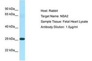 Synthetic peptide from N-Terminus of human NSA2 (O95478, NP_055701). Percent identity by BLAST analysis: Human, Chimpanzee, Gorilla, Gibbon, Monkey, Marmoset, Rat, Elephant, Rabbit, Opossum, Guinea pig, Lizard (100%), Orangutan, Mouse, Panda, Bovine, Bat, Horse, Pig, Platypus, Xenopus, Catfish, Medaka (92%), Turkey, Zebra finch, Chicken, Salmon, Smelt, Pike, Pufferfish, Zebrafish (85%).