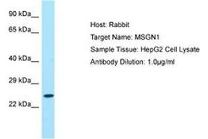 Synthetic peptide located between aa104-153 of human MSGN1 (A6NI15, NP_001099039). Percent identity by BLAST analysis: Human, Chimpanzee, Gorilla, Orangutan, Gibbon, Monkey, Galago, Marmoset, Mouse, Rat, Elephant, Panda, Bovine, Bat, Rabbit, Horse, Pig, Lizard, Xenopus (100%), Opossum, Guinea pig, Turkey, Zebra finch, Chicken, Platypus (92%).