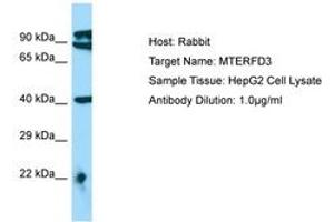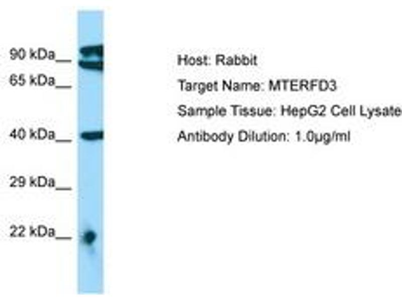 Synthetic peptide located between aa110-159 of human MTERFD3 (Q49AM1, NP_079474). Percent identity by BLAST analysis: Human, Chimpanzee, Gorilla, Orangutan, Gibbon, Rat (100%), Marmoset, Dog, Pig (92%), Mouse, Elephant, Panda, Bovine, Bat, Horse, Opossum (85%), Rabbit (84%).