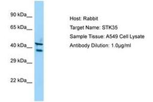 Synthetic peptide from C-Terminus of human STK35 (NP_543026). Percent identity by BLAST analysis: Human, Chimpanzee, Gorilla, Orangutan, Gibbon, Monkey, Galago, Marmoset, Elephant, Panda, Dog, Bovine, Bat, Rabbit, Horse, Pig, Opossum, Guinea pig, Turkey, Zebra finch, Chicken, Lizard, Xenopus (100%), Mouse, Rat (92%).