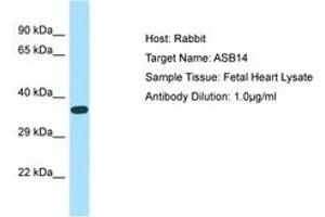 Synthetic peptide located between aa45-94 of human ASB14 (A6NK59, NP_569058). Percent identity by BLAST analysis: Human, Chimpanzee, Gorilla, Gibbon (100%), Orangutan, Panda, Dog, Bovine (92%), Monkey, Galago, Mouse, Bat, Rabbit, Guinea pig (85%), Rat (78%).