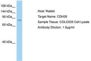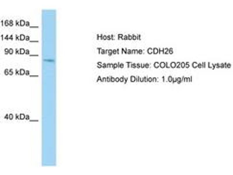 Synthetic peptide located between aa385-434 of human CDH26 (NP_817089). Percent identity by BLAST analysis: Human (100%), Chimpanzee, Gorilla, Orangutan (92%), Galago (85%).
