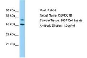 Synthetic peptide located between aa87-136 of human DEPDC1B (Q8WUY9, NP_060839). Percent identity by BLAST analysis: Human (100%), Chimpanzee, Gorilla, Orangutan, Monkey, Rat, Horse (92%), Gibbon, Dog, Rabbit, Guinea pig (85%), Bovine (84%), Mouse (78%).