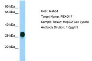 Synthetic peptide located between aa36-85 of human FBXO17 (NP_680474). Percent identity by BLAST analysis: Human, Orangutan, Monkey, Marmoset, Mouse, Rat, Panda, Dog, Bovine, Guinea pig (100%).