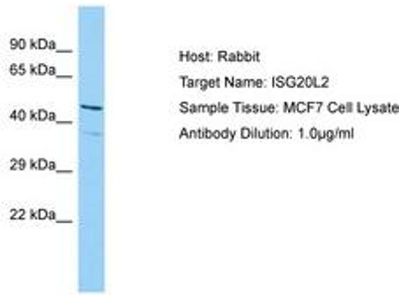 Synthetic peptide located between aa115-164 of human ISG20L2 (Q9H9L3, NP_112242). Percent identity by BLAST analysis: Human, Orangutan, Gibbon (100%), Chimpanzee, Gorilla, Monkey (92%).