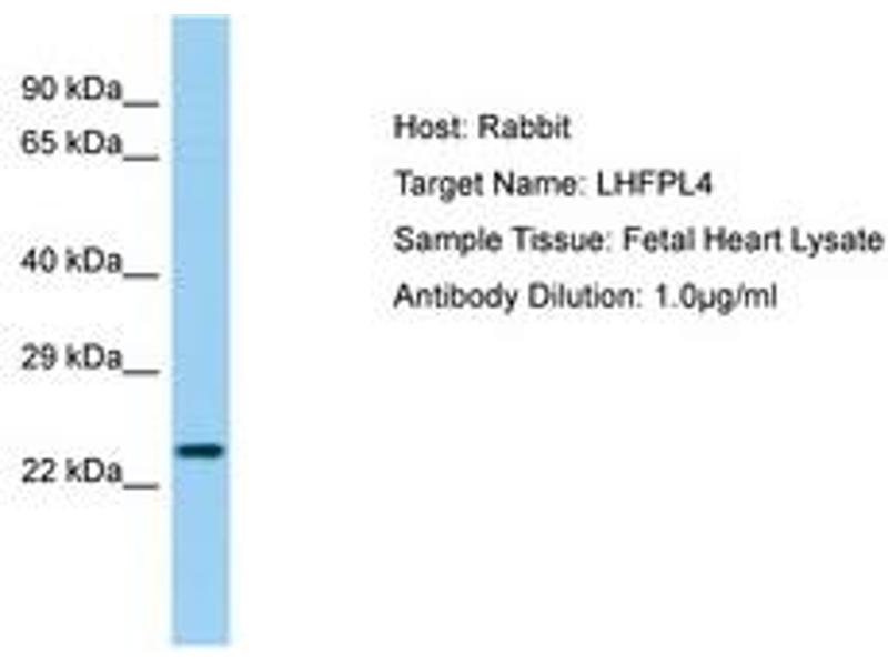 Synthetic peptide located between aa137-186 of human LHFPL4 (Q7Z7J7, NP_940962). Percent identity by BLAST analysis: Human, Chimpanzee, Gorilla, Orangutan, Gibbon, Monkey, Galago, Marmoset, Mouse, Rat, Panda, Bovine, Bat, Rabbit, Pig, Guinea pig (100%), Dog, Turkey, Zebra finch, Xenopus (92%), Lizard (84%).