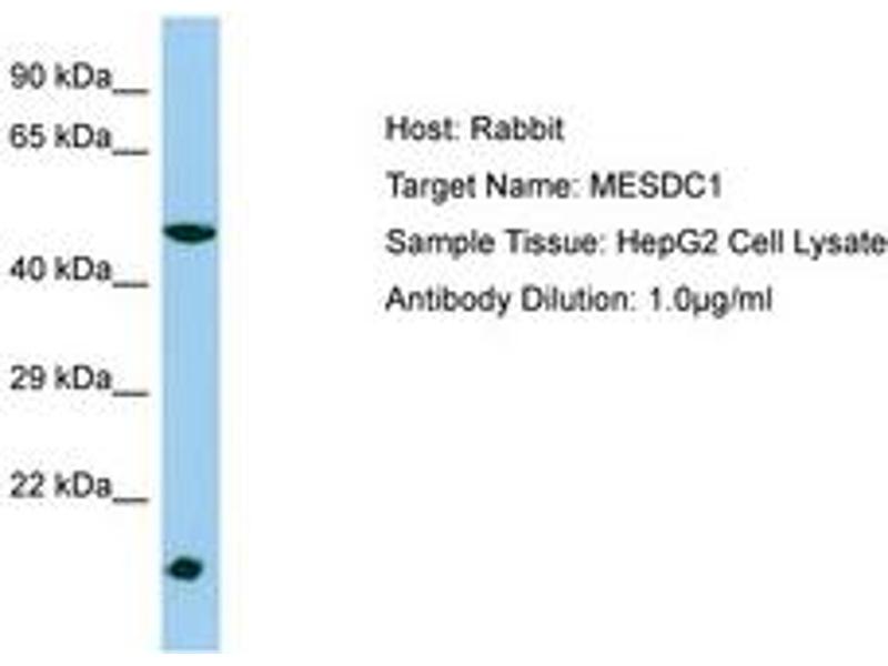 Synthetic peptide located between aa21-70 of human MESDC1 (Q9H1K6, NP_072088). Percent identity by BLAST analysis: Human, Chimpanzee (100%).