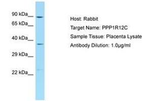 Synthetic peptide located between aa571-620 of human PPP1R12C (Q9BZL4, NP_060077). Percent identity by BLAST analysis: Human, Chimpanzee (100%).