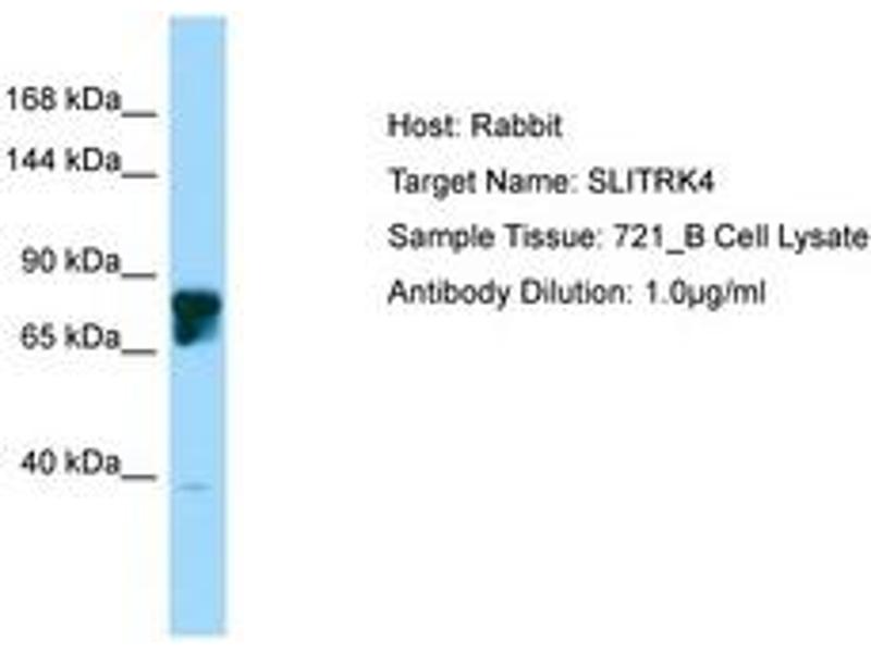 Synthetic peptide located between aa661-710 of human SLITRK4 (Q8IW52, NP_775101). Percent identity by BLAST analysis: Human, Chimpanzee, Mouse, Horse (100%).