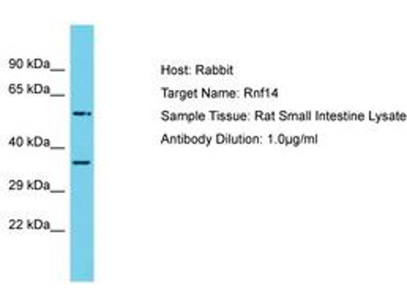 Synthetic peptide located between aa161-210 of rat Rnf14 (Q3ZAU6, NP_001030167). Percent identity by BLAST analysis: Rat (100%).
