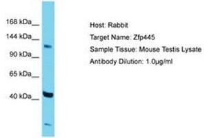 Synthetic peptide located between aa406-455 of mouse Zfp445 (Q8R2V3, NP_775540). Percent identity by BLAST analysis: Mouse (100%).