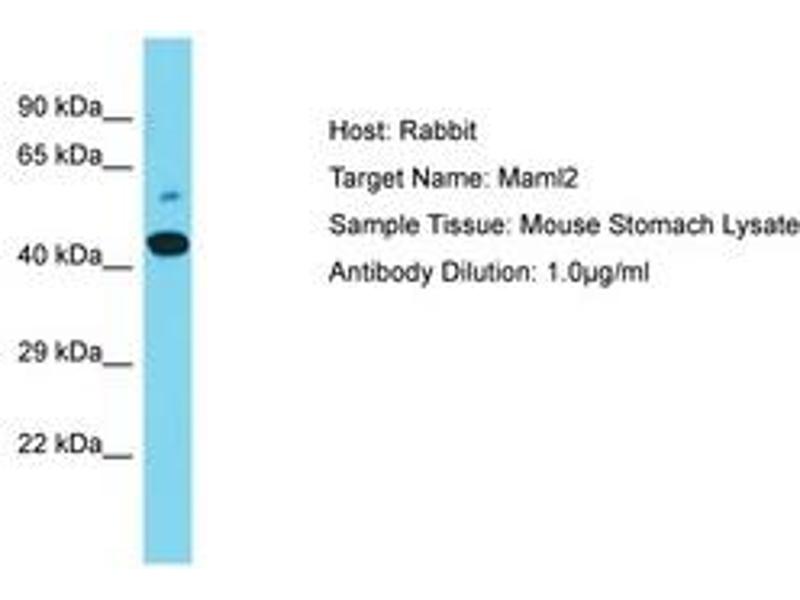 Synthetic peptide located between aa324-373 of mouse Maml2 (E9Q7L5, NP_776137). Percent identity by BLAST analysis: Mouse (100%).