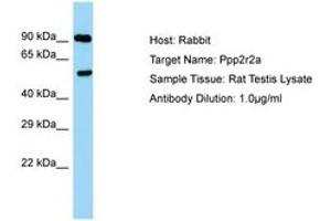 Synthetic peptide from C-Terminus of rat Ppp2r2a (P36876, NP_446451). Percent identity by BLAST analysis: Human, Chimpanzee, Mouse, Rat, Bovine, Rabbit, Horse, Pig, Guinea pig (100%).