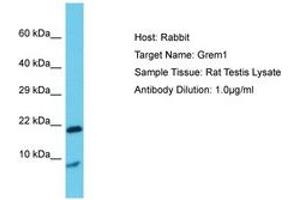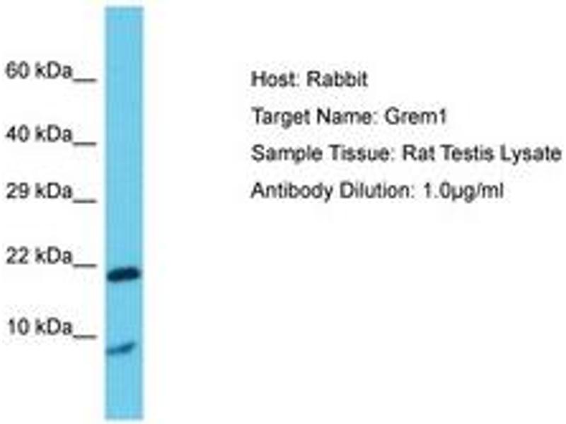 Synthetic peptide located between aa51-100 of rat Grem1 (O35793, NP_062155). Percent identity by BLAST analysis: Mouse, Rat (100%).